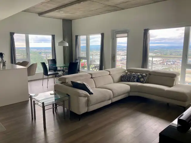 Grand 5 ½ (3 chambres, walk-in, 2 salles de bain, grand hall d’entrée, 3 grands garde-robes) dans un ensemble de condos locatifs (La Klé Phase III). Quartier Saint-Sacrement/Montcalm, à proximité de tous les services à pied (hôpital, pharmacie, épicerie, école, garderie, SAQ, restaurants, institution financière, clinique vétérinaire, esthétique, boulangerie, etc.) et des parcours de transport en commun. À 20 minutes de la rue Cartier. Appartement de coin au 15e étage, orientation sud-ouest, très fenestré avec une très grande galerie en L. Vue panoramique spectaculaire sur les Laurentides et le coucher du soleil. Finition moderne et soignée (comptoirs de quartz cuisine et salles de bain, plafonds et colonnes en béton, etc.). Air climatisé. Chauffage/électricité, toiles solaires et tous les électroménagers inclus. Piscine et salle d’entrainement accessibles de l’intérieur. Cession de bail pour prise de possession au plus tard le 1er février 2026. 3 100$/mois (3 275$ avec stationnement intérieur). Possibilité de louer un stationnement additionnel et un rangement.