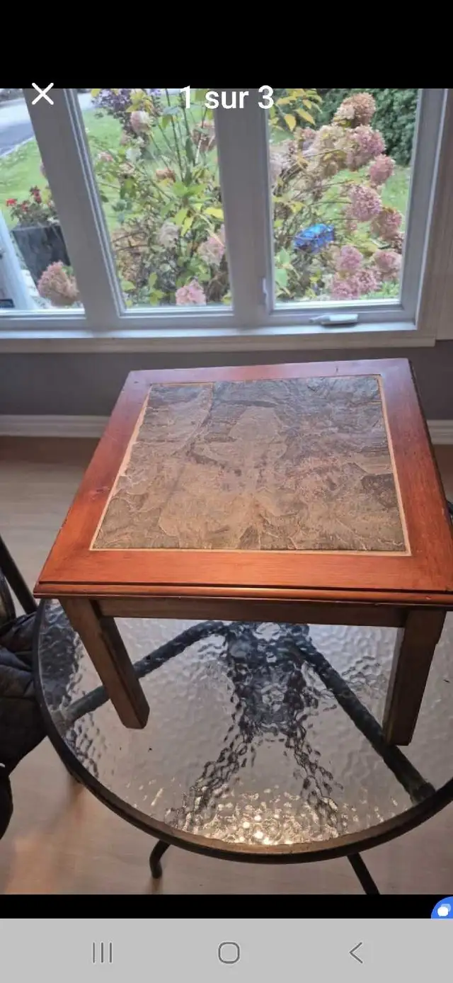 Duo de tables d’appoint style Mid-Century Modern / vintage, avec bois massif et dessus en pierre naturelle (ardoise). Idéales comme table de salon, bout de canapé ou table déco. Compactes, solides et élégantes, apportent un look moderne ou rétro à votre intérieur. Tables d’appoint, Mid-Century Modern, bois massif, vintage, pierre naturelle. Vendues en duo. Dimensions : 15,5" × 15,5".