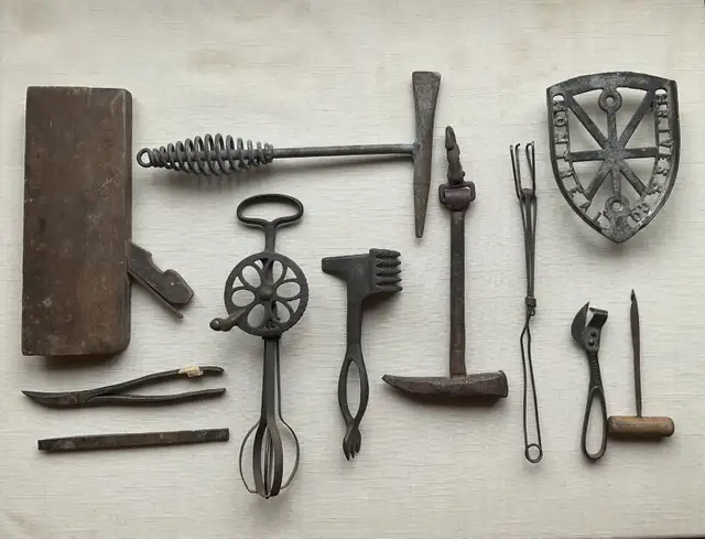 Lot de vieux outils anciens, Ouvre boîte 20$, ancien batteur Dover 1904, 50$, pilon 3 actions, 30$, marteau soudeur, 25$, base de fer à repasser, 25$, ancienne vrille manche en bois, 24$, ancien ciseaux courbé, 20$, marteau pour sabot chevreaux avec attache 80$, et rabot etc. Le tout pour 250$
