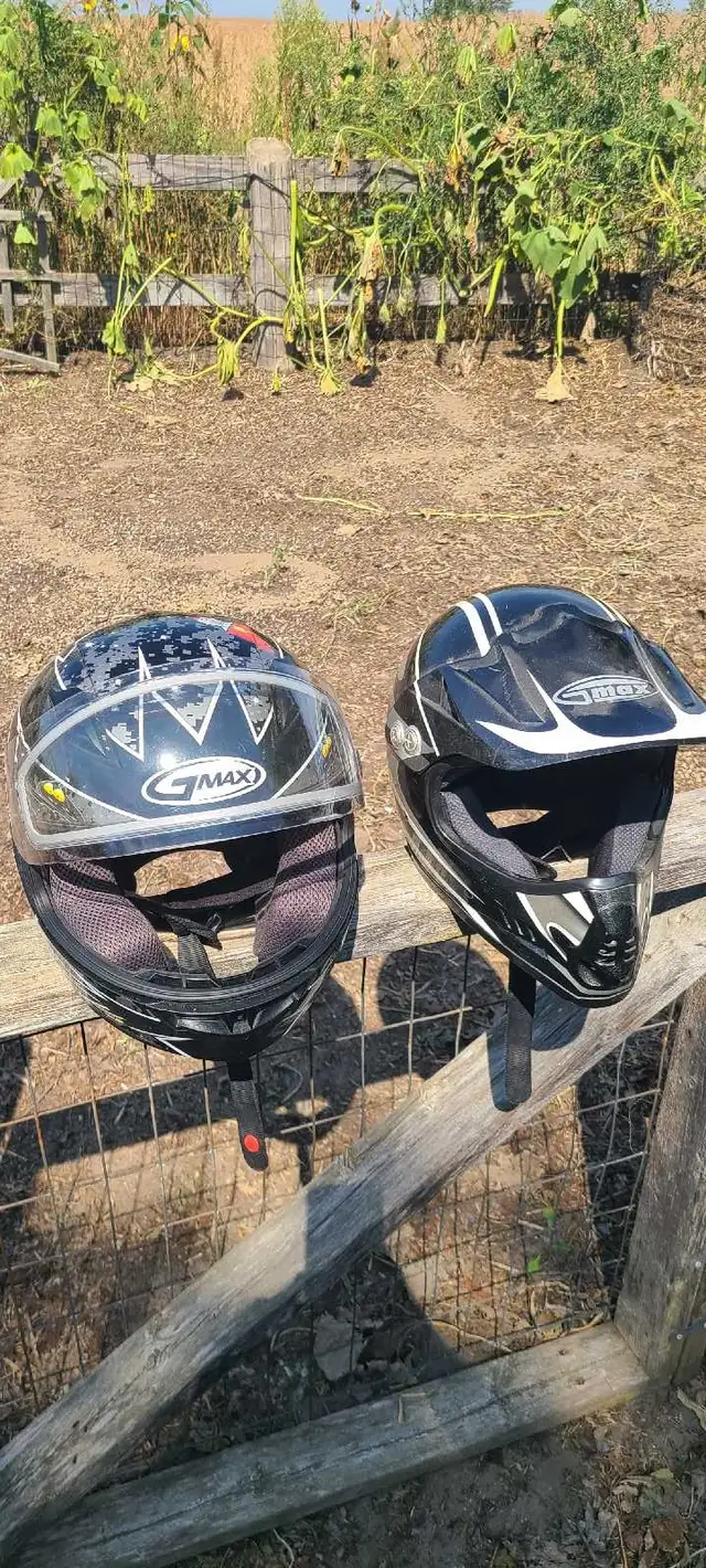 Yes they're available, will not respond if asked Two GMAX helmets One snowmobile youth medium, with full visor (son used as a dirtbike helmet) One dirt bike youth L/XL Make me an offer for one or both