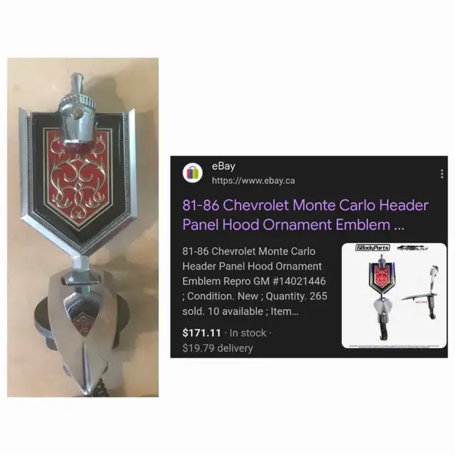 1984 Monte Carlo hood emblem...$60. Perfect for a collector. Fastest pick up is Foymount. Barry's Bay and Eganville on certain days