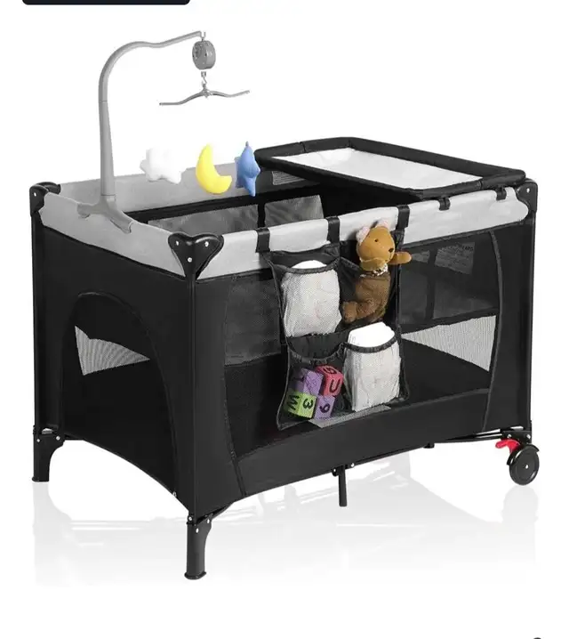 This nearly new playard combines the functionality of a baby crib and playpen, featuring a bed, diaper changing table, hanging toy mobile, and side storage, all in one portable design.