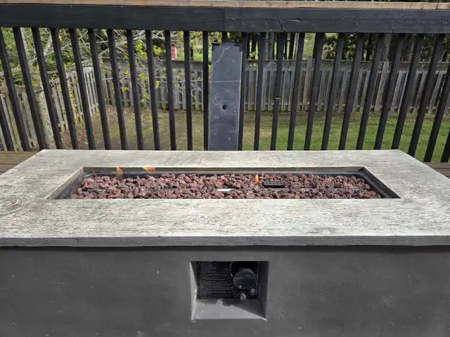 This nice fire table is perfect for those cool evenings! It has a stylish concrete base and lava rocks. The table is in used condition but functions perfectly.
