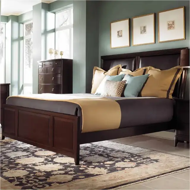 Elevate your bedroom with this stunning, used Kincaid Alston queen bedroom suite, crafted from solid European beech wood, known for its durability and beautiful grain. This elegant set includes a queen-size bed frame, a spacious 14-drawer dresser with a granite top, a round decorative mirror, and two charming 3-drawer nightstands. The rich, dark finish adds a touch of sophistication to any bedroom décor. This is a used suite with some signs of wear and tear.