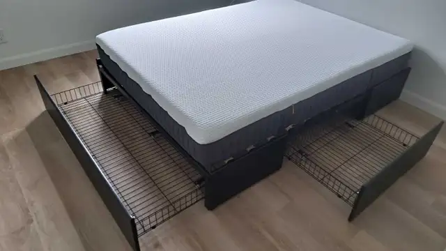 Vendu avec la base de lit - base avec 3 tiroirs de rangement, lattes en bois, base métal avec similicuir