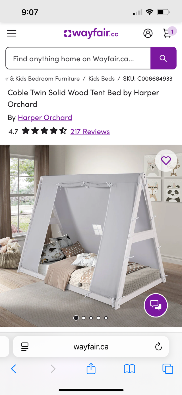 Wayfair twin toddler bed with tent canopy. White wood. Grey tent. Selling because our daughter doesn’t like it. Hardly used. Pickup only. $90
