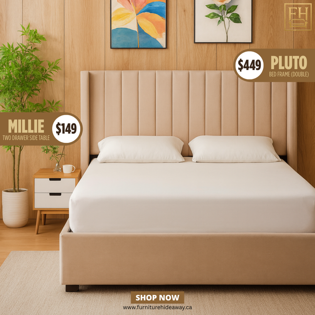 Grab this side table + bed frame duo, a perfect blend of modern design, warm tones, and minimalist aesthetic.