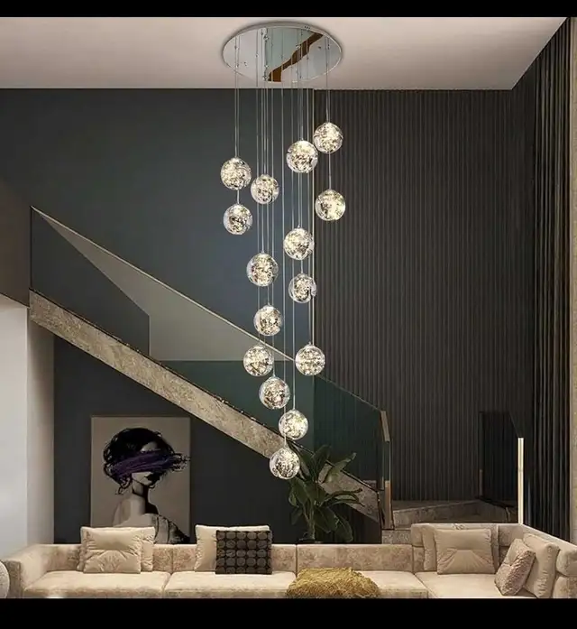 ★ Staircase chandelier size: Up to 98 inches/250 centimeters of suspension wire, with adjustable length that can be shortened to the ceiling. Pendant base diameter: 23.6 inches/60cm, glass ball diameter: 6 inches/15cm. Applicable area: 10-15 ㎡. The pendant lamp does not support dimming, and the fixed color temperature of the light source is 4000K.