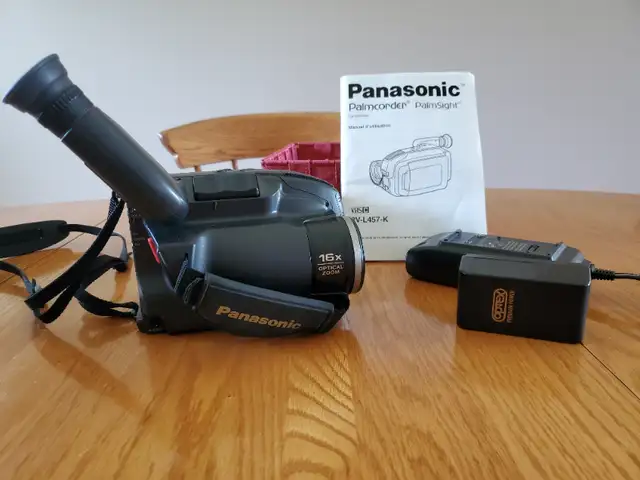 Pananasonic Palmsight PV-L457. This camcorder was barely used , sitting in the bag in our closet for many years so it's in new condition. Includes charger for external battery, AC cord, audio video cords and bag. REQUIRES NEW EXTERNAL RECHARGEABLE BATTERY.