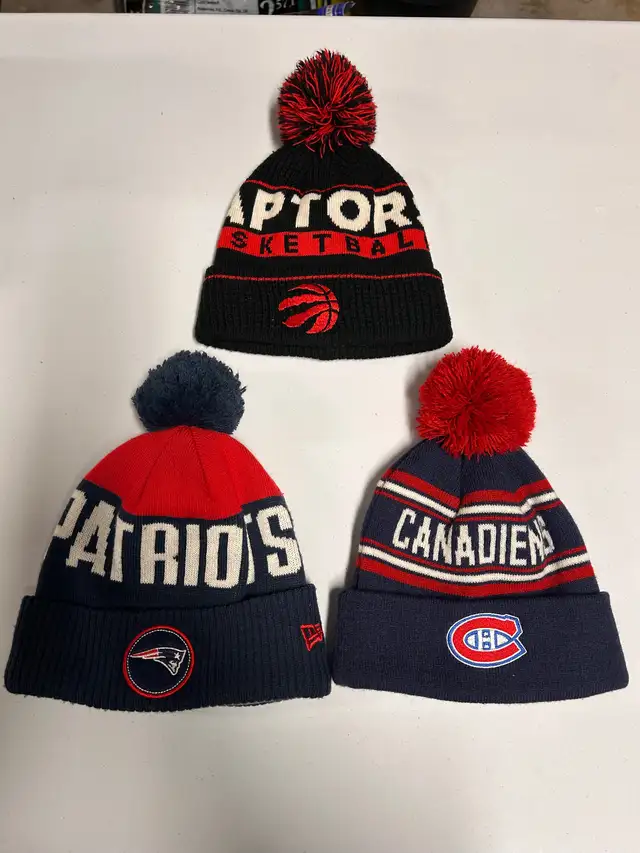 Youth one size fits all winter hats, Toronto Raptors, New England Patriots and Montreal Canadiens. Excellent condition, like new. $10 each firm