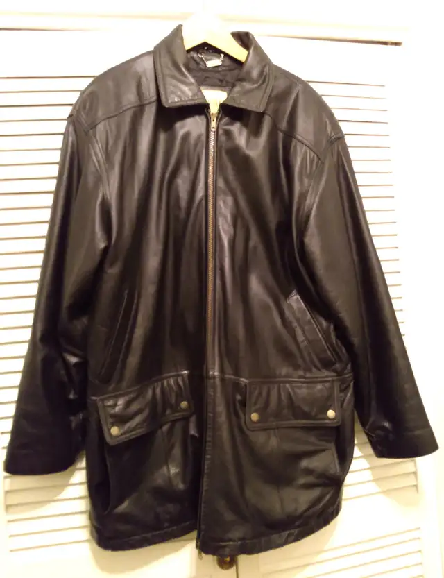 This is a smart black leather coat from the Canadian leather garment specialists Danier. Depending on how tall you are, it's thigh-length or knee-length. It is a vintage coat but it has been well looked-after and is in superb condition.