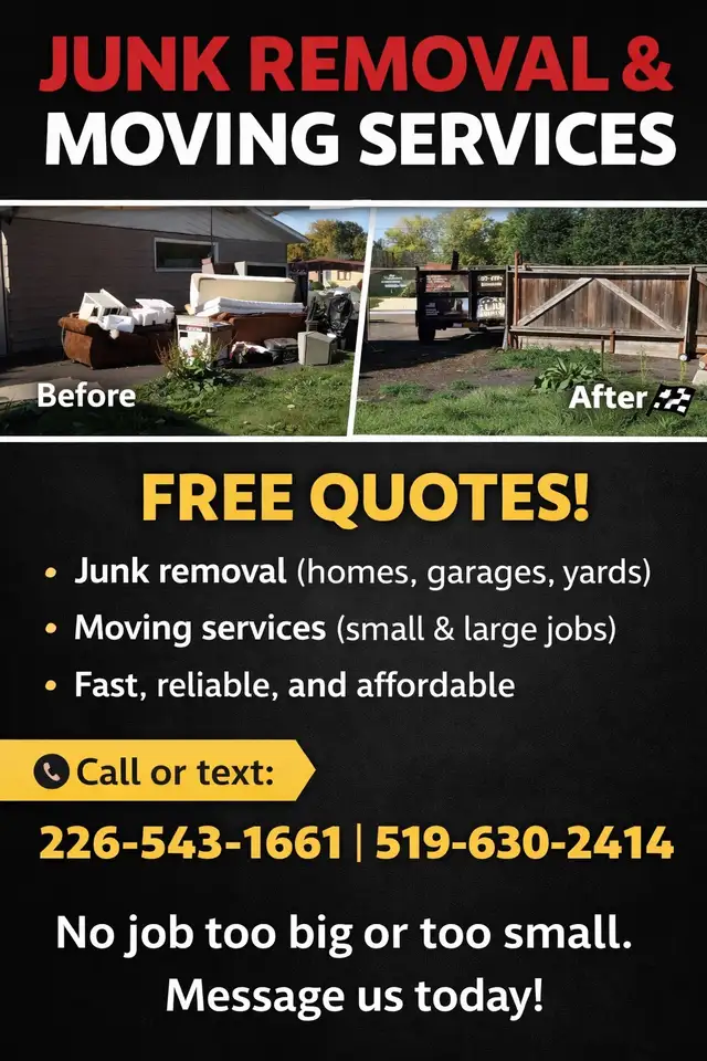 We do junk removal and moving we give fair pricing we work in London and the souronding city’s and towns we also do drywall panting installation and rapier just give us a call and show us and tell us what you need and we will give you a free quote