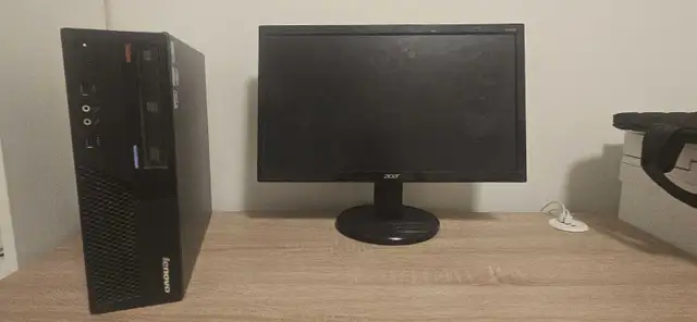 This is a used Lenovo PC complete with a monitor, perfect for basic computing tasks. It's in fair condition, showing some signs of wear, including a scratch on the monitor screen as pictured, but is fully functional and ready to use. It would be great as a starter computer.