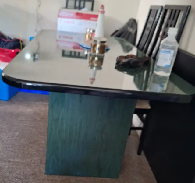 Dinning room table with chairs...to big for hubby and i,, downsizing,,400.00 dollars paid over 2000 for it,, solid, dark green and black. And a matching bakers rack 50.00 dollars,,