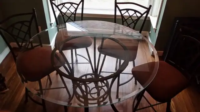 Circular Glass Table plus four chairs,45 inch diameter,3foot tall.