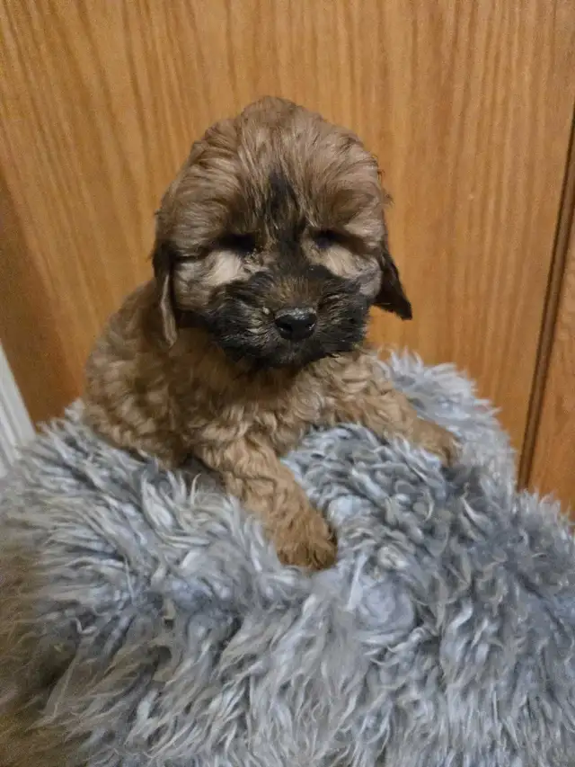 This cute friendly American Cockapoo pup was born October 16th .There is a brown with black mask male available at this time .He is a healthy friendly little buddie cute as a button. Should mature to about 20 to 25 lbs. Mom is the American Cockapoo and dad the poodle. Mom and dad both weigh 20 to 25 lbs. Should be hypoallergenic and no shed . My Grandkids have had fun playing with them. He will be rehomed with his first shots and the Vet certificate to show health status. Wormed several times a sample of food and a puppy training instructions. 5 minutes from exit 218 from the 401 near Ingersoll. One sitting is mom. Pictures of both mom and dad.