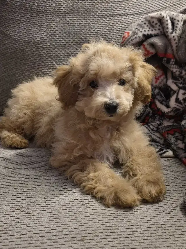 Hi, I’m Aspen, I am a 14 -week-old Maltipoo girl and a pint-sized explorer in training. I’m playful, curious, and a little bit fearless in that classic puppy way. I’ll happily trot after a drifting snowflake or a piece of paper, investigate every new corner of the yard, and then curl up in your lap when it’s time to recharge. I love meeting people and I’m ready to be part of a family that includes me in the day-to-day.