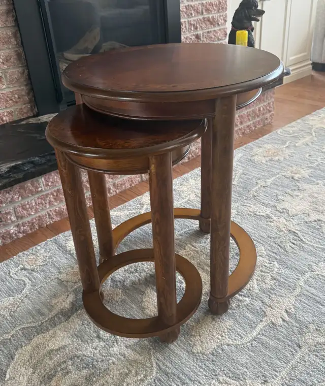 Solid wood cherry finish nesting tables. Very sturdy. Light surface scratches on table top Dimensions Large table 21” diameter Height 26” high Small table 14” diameter Height 23”