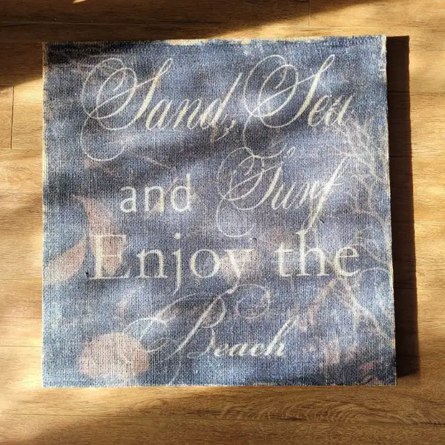 Add a touch of seaside charm to any room with this delightful canvas art piece, perfect for creating a relaxing atmosphere. The artwork features the phrase 'Sand, Sea, and Surf, Enjoy the Beach' in elegant script, set against a textured background that evokes the feel of a coastal getaway. This piece has some minor wear, consistent with its use, adding to its unique character.