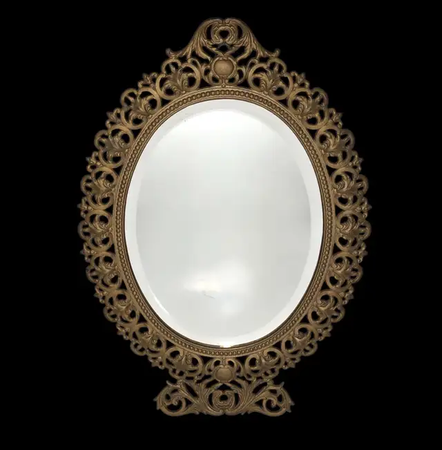 For sale is an oval, ornate Victorian cast iron hanging mirror with beveled glass and matte gold finish (Note; the mirror has a gold tin backing which someone has covered in green felt at some time in the past, I would guess so that the mirror could be used as a vanity tray “see 7th photo”). Frame measures 18-1/4 inches in height and 13-1/8 inches in width, the oval mirror measuring 11-5/8 inches in height by 8-7/8 inches in width, being in excellent condition with the original mirror showing some signs of aging (Note; the mirror has a 5/8 of an inch long scratch on the backside of the glass "see 3rd photo", and some minor spotting and fogging. I used black and white board to highlight these marks which in person are fairly minor, and actually enhance the overall aesthetic appearance of the mirror “see photos”). Marked on the backside of the frame with what looks like the number “7475”.