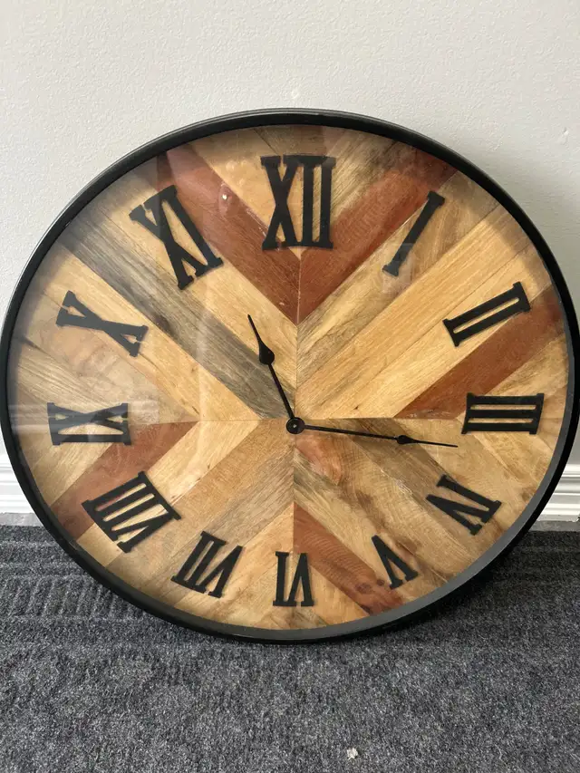 Stylish wall clock. Strong metal frame with wood face inlay. Takes 1 AA battery. Make an offer.