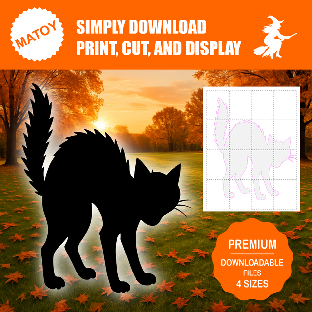 Add vintage fright to your Halloween scene with this Classic Scaredy Cat Silhouette from Matoy! Shown in a side view with arched back, raised tail, and wide-eyed tension, this timeless pose captures the startled, spooky charm of a cat caught in the Halloween night. Its bold outline makes it instantly recognizable and a perfect fit for retro or modern holiday displays.
