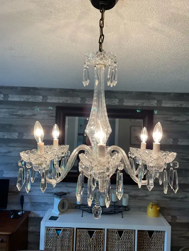 Authentic Waterford in perfect condition! Brilliantly hand-cut in Ireland, the Comeragh pattern features dazzling wedge and prism cuts that scatter light in a spectacular display. Six sweeping crystal arms, candle-style lights, and cascading prisms create timeless elegance. Discontinued and hard to find in the 6-arm size — a stunning statement piece for any grand space.