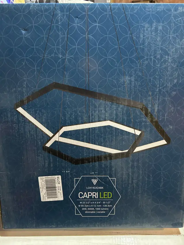 Illuminate your space with this modern Canarm Capri LED Chandelier, boasting a sleek matte black finish and energy-efficient LED lighting. This new-in-box fixture adds a touch of contemporary elegance to any room with its unique geometric design.