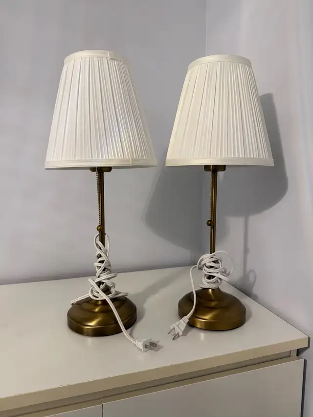 Brighten up your bedside with this set of two used Ikea Bordslampa table lamps, each featuring a classic design with a white pleated shade and brass-tone base, providing a warm and inviting glow to any room. The lamps have been well-maintained and are in good condition, ready to add a touch of elegance to your home decor.