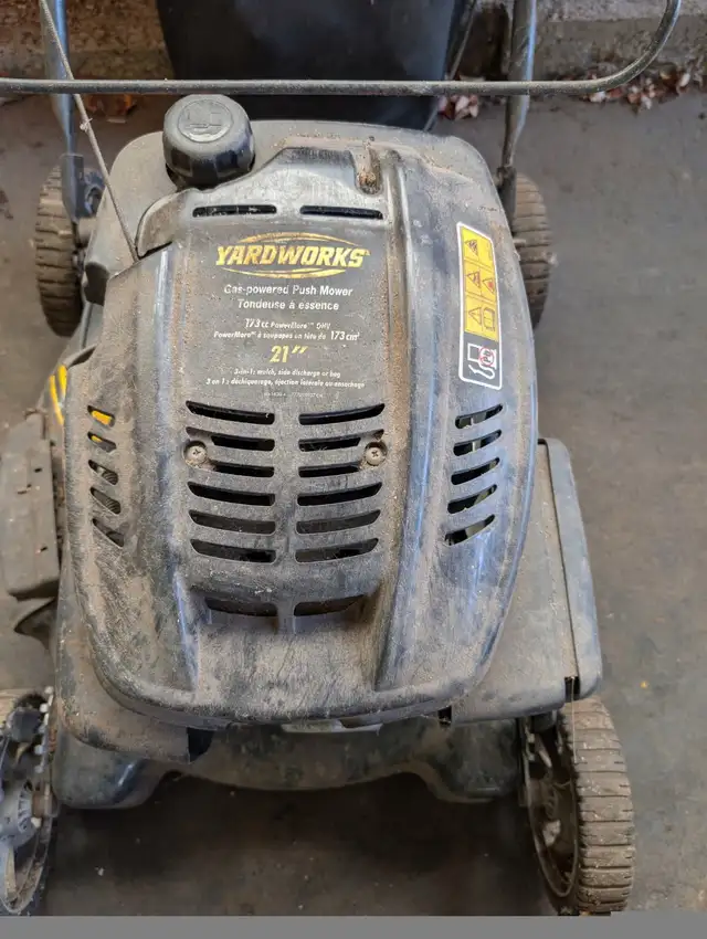 For sale is a gas powered Yardworks lawn mower. Unit comes with rear collection bag and side discharge blank off. 173cc engine.
