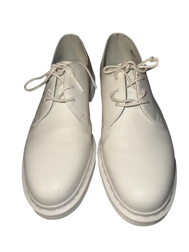 These Dr. Martens 1461 Mono white Oxford shoes feature a leather upper, lace-up closure, and a sleek, monochromatic design in women's US sizes 10M and 11W. These shoes are in good condition, showing some signs of wear. Ready to step out in style? These Docs are a blank canvas waiting for your personal touch!