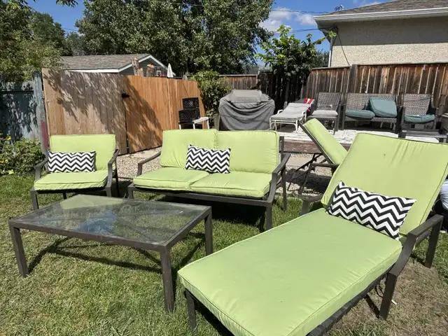 Beautiful 4 piece patio set included 2 seater,chair , lounge chase and cofee table This set is in excellent condition no rust or damage. Lounge chase has adjustable positions all cushions included