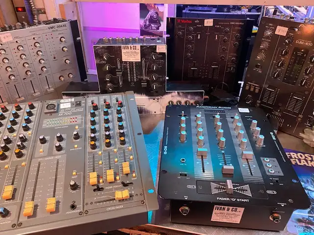 DJ mixers $100 and $300. each. Color gels 2 ft. $5. each 10 in $1. each. 10,000 to choose from. Ivan 514 383 1101 sound systems, mirror balls. stage lighting. black lights. lasers. Fog machines. Sparkulars. Black lights. etc.