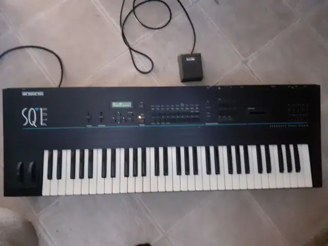 The Ensoniq SQ-1 Plus is a velocity (and MIDI pressure) sensitive 61 key (21 voice, 24 channel multitimbral) synthesizer, featuring 167 waveforms, dual multimode digital filters, three 4-stage envelopes, an LFO, versatile modulation, stereo effects, 8 track (+ 8 track song) real or step time sequencer, auxiliary outputs, and MIDI. The 80 user editable presets can be saved via MIDI SysEx, 3.5" DSDD disk drive, or cartridge (another 100 presets are in ROM).