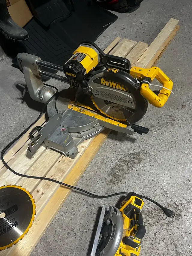 Dewalt DW708 dual bevel mitre saw. Works great. Guard linkage is broken, so the guard doesn’t swing. I have it fixed in place. Will throw in an extra blade.