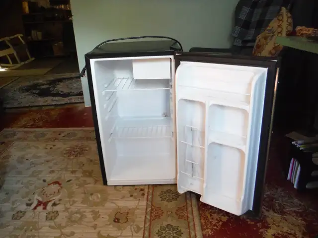 Small Danby fridge with small freezer compartment. Black with stainless door. I got gifted a small apartment fridge, so no longer required.