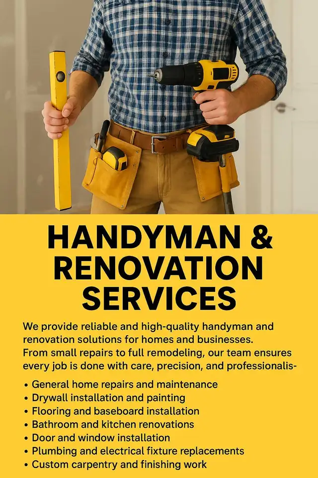 We provide reliable and high-quality handyman and renovation solutions for homes and businesses. From small repairs to full remodeling, our team ensures every job is done with care, precision, and professionalism.