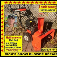 Rick Mobile Snowblower, lawnmower repair. I’ve been away on holidays this summer. I’m back on the 14th to take appointments. I am fully mobile and I come to you.. If it doesn’t start or it’s hard to start and won’t keep running it’s usually a carburetor overhaul and rebuild. Most repairs are about $130 $140 and if I can’t fix it I don’t charge you anything If you want a full tune up that includes oil, spark plug, air filter, and blade sharpening it’s $130 to $140. I’ve been in business for over 20 years All work comes with a six month warranty. Call Rick at 905-517-1004 I do Hamilton,Ancaster, Stony Creek
