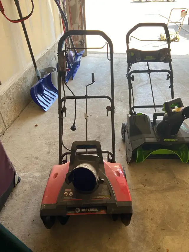 I'm selling a King Canada electric snow thrower with an 18-inch clearing width, perfect for quick snow removal on walkways and driveways, and it includes a long extension cord. This is a used unit but still works well for those lighter snowfalls we get here.