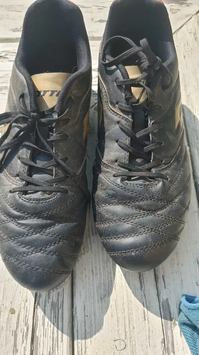 Crampons soccer marque Lotto taille 8.5H/9.5F condition usée mais bon encore une saison. Lotto soccer cleats size 8.5M/9.5W in worn condition but still useable for another season.