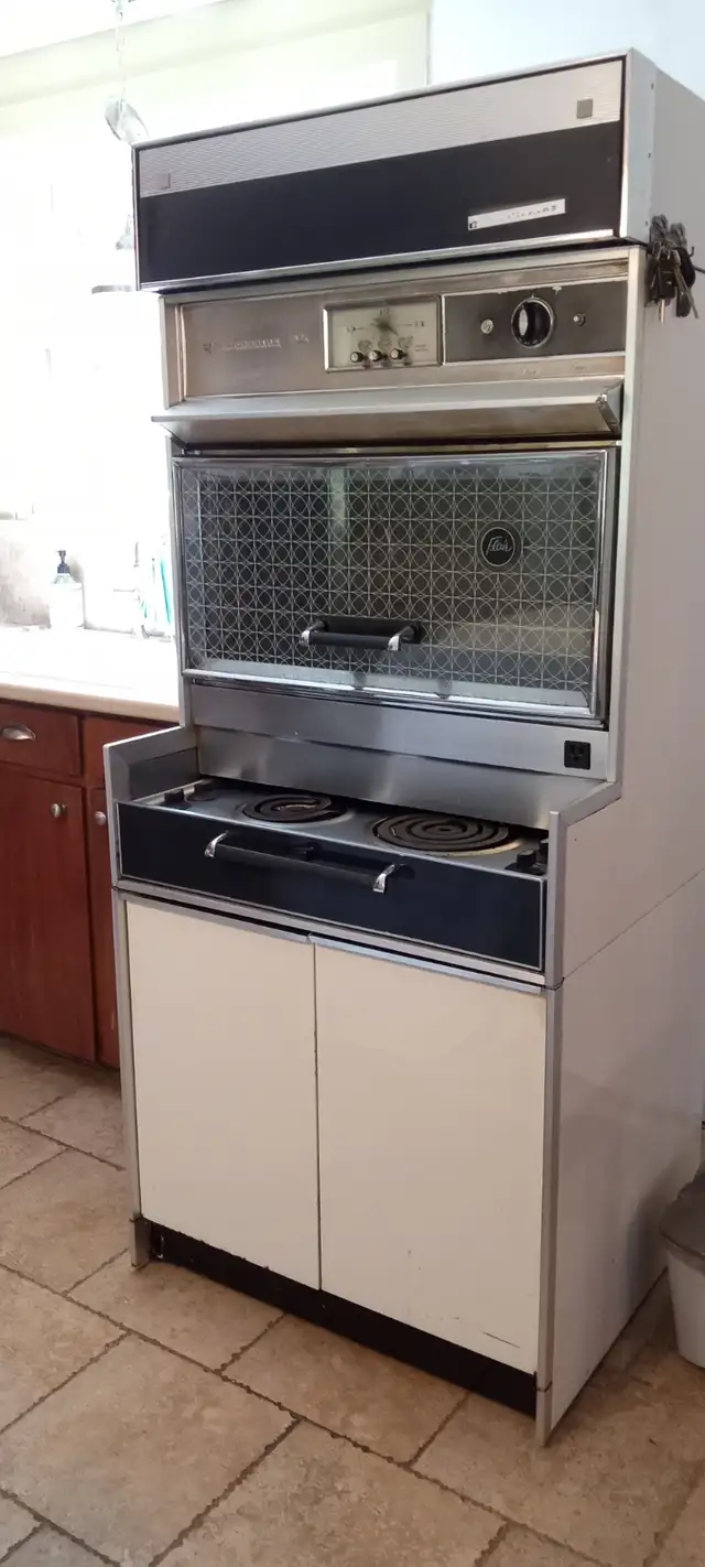 Cuisinière rétro (1964) fonctionnelle avec hotte intégrées et armoire de rangement dans une seul meuble.