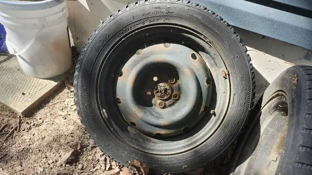 4 steel wheels and tires. 205/55R16. 5x100 bolt pattern. Tires are worn. Would make decent winter rims.