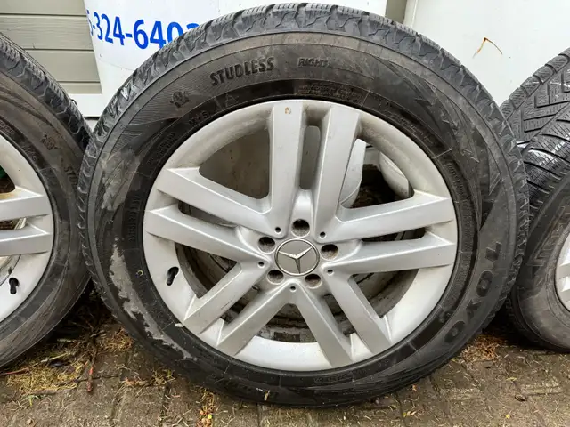 I am selling a set of four used winter tires mounted on rims, originally from a 2015 Mercedes-Benz GL350. These tires provided reliable traction throughout the winter season. Showing signs of wear, they still offer decent tread life for the upcoming winter. Get ready for snow and ice with this complete set!