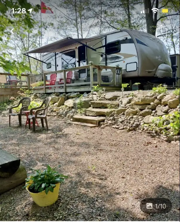 Nice 28’ trailer on a private lake front site at a campground on Dog Lake north of Kingston. Has 1 queen bed in room at front of trailer and pull out couch in living room. Nice wrap around deck overlooking the lake. Sits above the lake, with lake access if desired for a boat, and privacy provided with a nice canopy of trees. Enjoy the rest of this season and secure your new spot for next season!