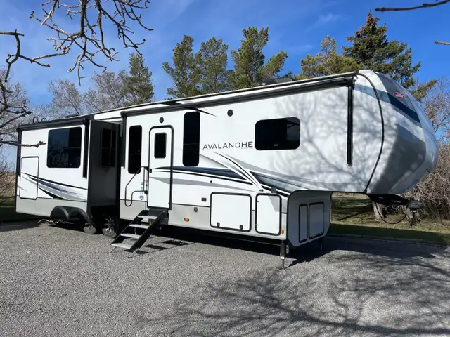 The 2022 Keystone Avalanche 338GK is a luxury fifth-wheel RV with a 100-inch wide-body design and full-profile construction, offering spacious living. It boasts a variety of features, including a large 18 cu ft refrigerator, a 35,000 BTU furnace and two Quiet Cool air conditioners. The 338GK model is designed for comfort and livability, with features like power awnings, quad entry steps, and a fireplace tile surround.