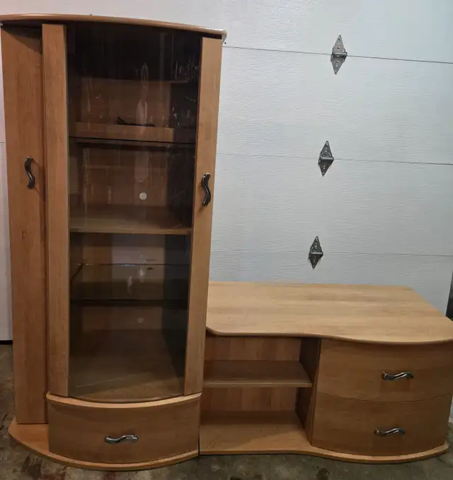 TRES BEAU MEUBLE POUR TV EN BOIS MIEL PALE MARQUE CONCORDIA COMME NEUF, PORTE EN VERRE TREMPE ECLAIRAGE INTERIEURE, TIROIRS ET RANGEMENT $100.00 819 609-5530