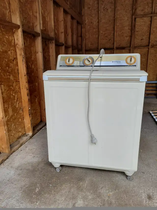 Machine à laver portative, semi-automatique. Double cuve (une pour le lavage et une pour l'essorage) avec pompe de vidange. 2 cycles: régulier et délicat. Se branche facilement au robinet. Très bon état. Largeur 27.5 pouces, profondeur 16 po. hauteur 32 po.