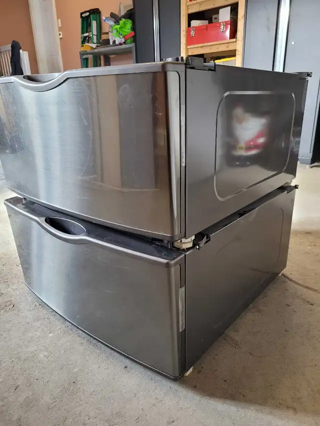Deux piedestaux pour laveuse-sécheuse. Étaient à l'origine pour des Samsung d'une largeur de 27 pouces. Compatible avec toute laveuse-sécheuse de la même dimension. Vendues en paire.