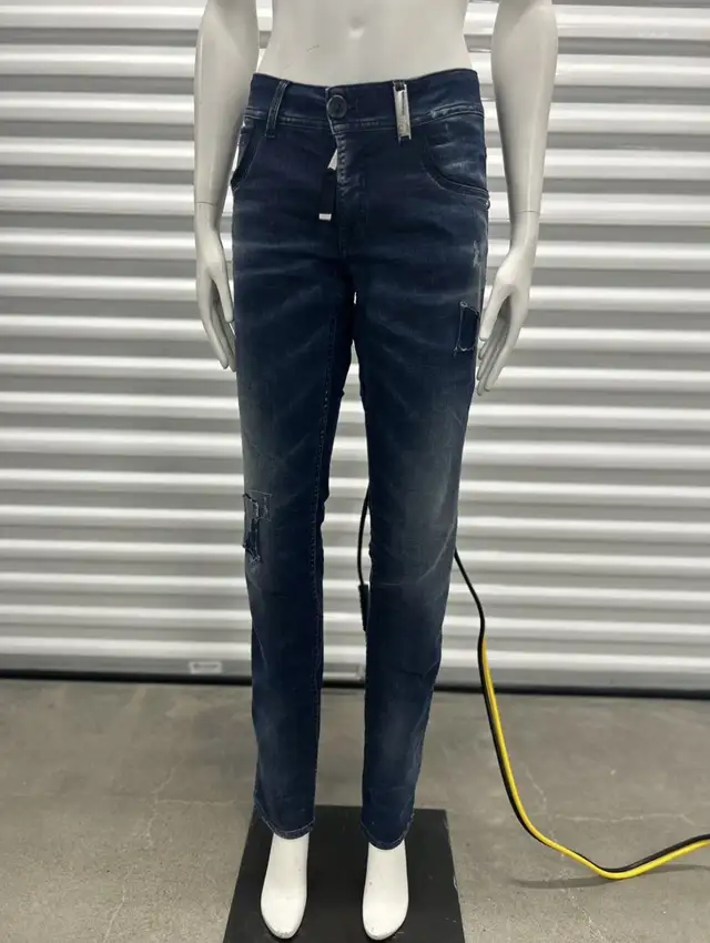Dark wash denim jeans. Features distressing and patches. Slim fit. Excellent condition.