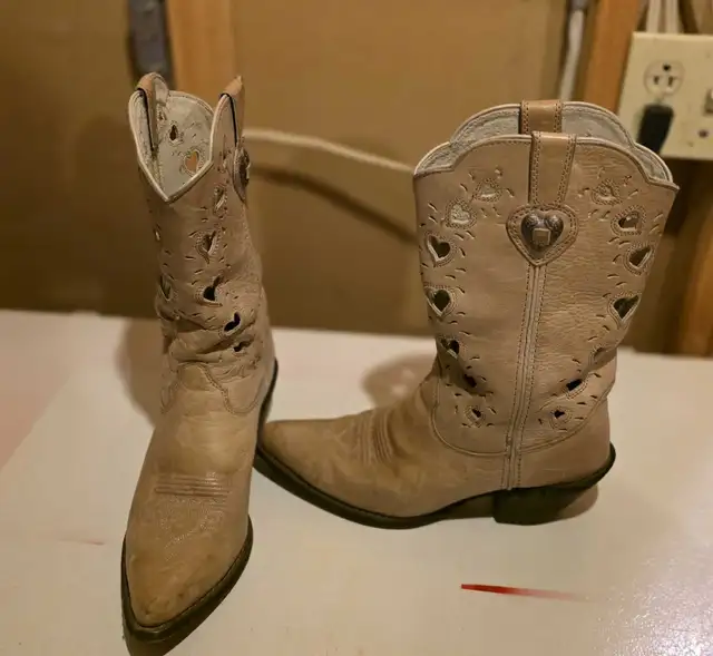 These are a stylish pair of tan-coloured cowboy boots with heart-shaped cutouts, perfect for adding a touch of western flair to any outfit. As you can see in the images, these boots are not new and are in used condition, ready for their next adventure!